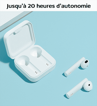Xiaomi a intégré une nouvelle génération de puces de gestion de la consommation d’énergie permettant d’obtenir 5 heures d’autonomie pour les écouteurs et jusqu’à 20 heures en utilisant le boîtier de charge.