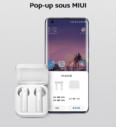Les Xiaomi Mi True Wireless Earphones Air 2 SE et MIUI fonctionnent mutuellement. En effet, lorsque vous ouvrez le boîtier de chargement, le téléphone affiche un pop-up de connexion du casque ! Vous pouvez visualiser le niveau de batterie restant des écouteurs et du boîtier.