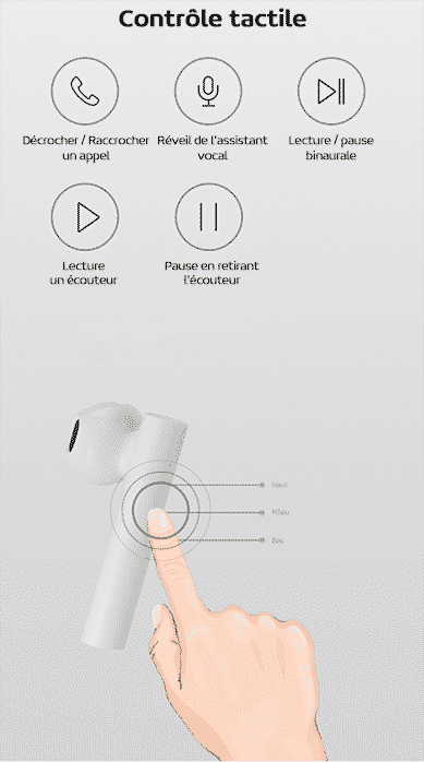 Le contrôle de la musique, du réveil de l’assistant vocal, de vos appels … est réalisé facilement à l’aide de la touche tactile intégrée à chaque écouteur. L’utilisation est simple et pratique.