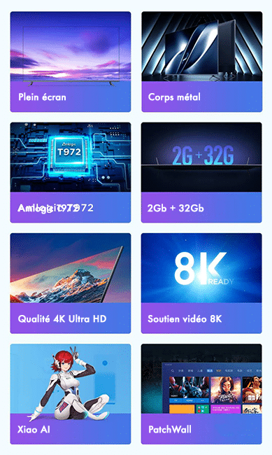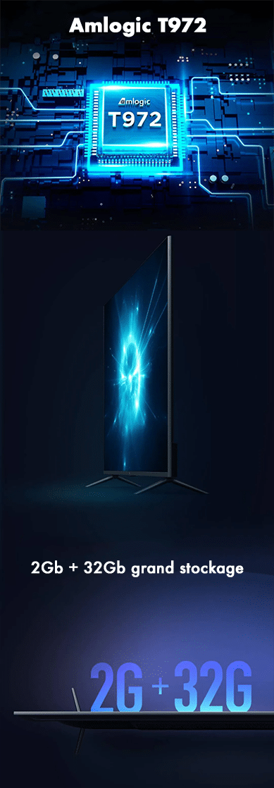 Mais que renferme cette Xiaomi Mi TV Full Screen Pro ? La Xiaomi Mi TV Full Screen Pro est équipée de la puce la plus avancée du secteur de la télévision développée conjointement par Xiaomi TV et Amlogic. La nouvelle puce Amlogic T972 est basée sur une architecture de processeur quad-core avec une fréquence jusqu’à 1,9Ghz. Xiaomi a donc annoncé une augmentation des performances de 63% et d’une réduction de la consommation d’énergie de 55%. Cette puce permet également la prise en charge de la lecture de vidéo 8K, grâce au moteur de traitement d’images de 9e génération. Elle dispose de 2Go de Ram et d’un stockage interne de 32Go.
