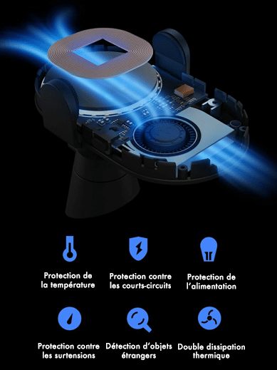 Le voyant d’accueil bleu en forme d’anneau s’allume après la mise sous tension et il est parfaitement visible la nuit lorsque vous conduisez. Sa surface en verre lui permet d’améliorer l’efficacité de la dissipation de chaleur mais également accélérer la charge. Il est équipé d’une double dissipation de chaleur, grâce à un ventilateur interne qui va assurer une dissipation active, ainsi que le support métallique qui va assurer une dissipation passive. Lors d’une charge à pleine puissance, si la double dissipation n’est pas suffisante, une protection contre la surchauffe se déclenche et réduit considérablement la puissance. Il dispose également d’une protection contre les courts-circuits et les surtensions.