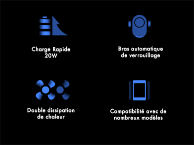 Accroché à une grille de ventilation, le chargeur dispose de deux bras de serrage qui s’ouvre jusqu’à 81.5mm afin de s’adapter à la majorité des téléphones du marché. Approchez votre téléphone, un capteur infrarouge ouvrira automatique les bras de serrage. Les bras se refermeront en tenant fermement votre téléphone. Pour le retrait du téléphone, il suffit de tenir le téléphone en appuyant sur le bouton latéral.