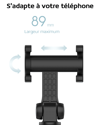 Le support du téléphone dispose de protection anti déparant permettant de ne pas abîmer votre téléphone. Il s’adapte facilement à la taille du téléphone (jusqu’à 89mm maximum). Il tourne facilement à 360°, vous pouvez l’utiliser en mode horizontale ou verticale.