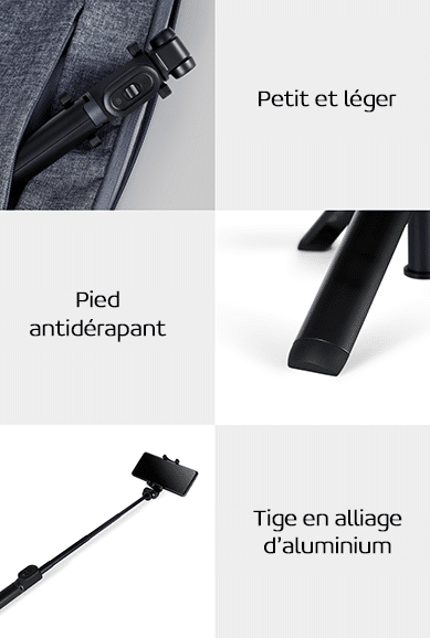Mais Xiaomi a été plus loin, en proposant un produit léger de 161g seulement, très facile à transporter. La marque a également intégré des tampons en silicone antidérapant afin d’avoir une meilleure stabilité. La tige quant à elle est en alliage d’aluminium anodisé à 4 sections permettant d’atteindre une fois dépliée une longueur de 570mm.