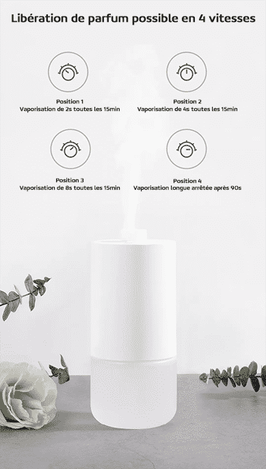 Le bouton permet de choisir la durée de vaporisation dans l’air du parfum toutes les 15 minutes. Grâce à la technologie d’atomisation microporeuse, le parfum est instantanément libéré à travers des centaines de minuscules particules de la taille d’un micron, et se diffuse rapidement dans l’air, déclenchant une expérience sensorielle agréable et confortable.