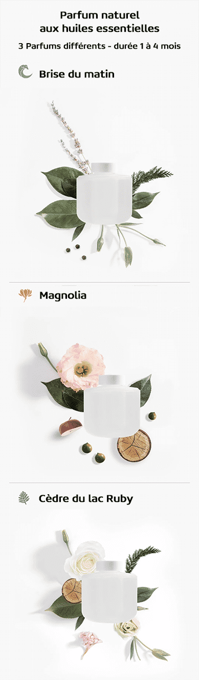 Pour ce qui est du design de ce nouveau produit, la marque a gardé celui du distributeur de savon. Il est donc rond avec un bouton situé sur le dessus de l’appareil. Et sur la partie basse, vous trouvez le réservoir de parfum naturel (plusieurs sont disponibles : Brise du matin, Magnolia ou Cèdre du lac Ruby). Voyagez et ressentez ainsi le goût de la vie avec ces parfums.