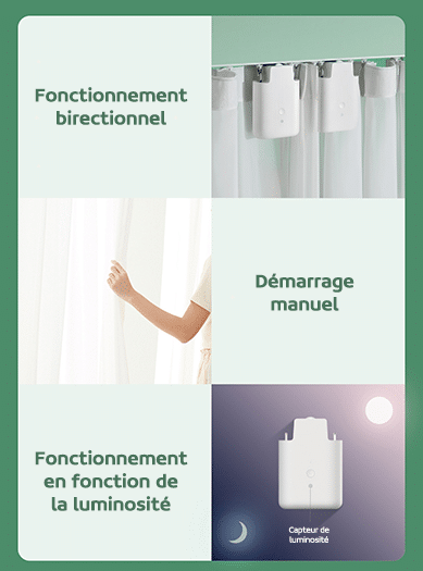 Le rideau s’ouvre et se ferme en douceur grâce à sa conception innovante. L’algorithme intégré ajuste automatiquement la force uniformément.  Le balayage photomagnétique à effet Hall de haute précision permet un réglage de la course intelligent et plus précis.