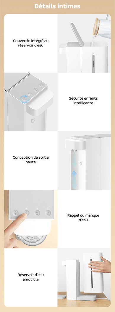 Xiaomi a intégré plein de petits détails qui facilitent la vie. En effet, le réservoir d’eau amovible dispose d’un couvercle qui se rabat permettant un remplissage d’eau plus facile. De plus la sortie d’eau est située assez haut permettant de remplir différentes tailles de tasse. Une fonction de rappel de manque d’eau.