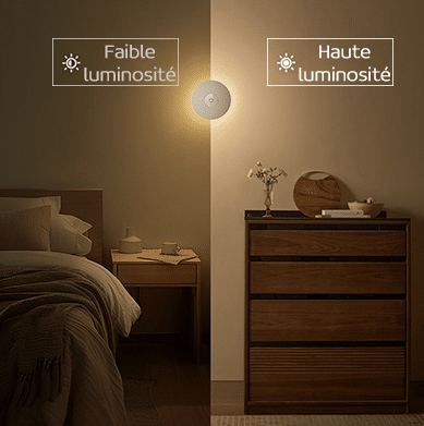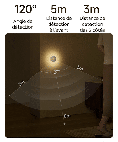 La veilleuse intègre un double capteur photosensible et de détection humain permettant de capturer avec sensibilité les mouvements et allumer quand nécessaire la lumière. La détection est réalisée sur un angle de 120° avec une distance de détection face à la veilleuse de 5m et sur les côtés, la distance est de 3m.