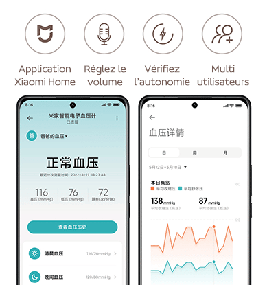 L’application Xiaomi Home permet de visualiser les graphiques de données de pression artérielle en connectant l’appareil en Bluetooth. L’application permet de comprendre la tendance des changements de pression, ce qui est pratique pour un réglage et un contrôle rapides. Via l’application, vous pouvez régler le volume, gérer les utilisateurs (utilisation multi-utilisateurs), …