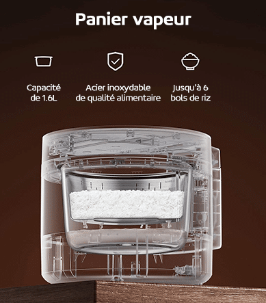 Retrouvez le bon goût du riz cuit à la vapeur grâce au panier cuisson vapeur d’une capacité de 1.6L fourni. Ce panier est en acier inoxydable de qualité alimentaire et permet au riz d’absorber complètement la vapeur à haute température. Il est ainsi possible de faire jusqu’à 6 bols de riz.