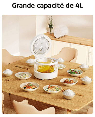 Le Rice Cooker dispose d’une capacité de 4L permettant de contenir un poulet entier. Il est donc possible de réaliser un repas unique pour toute la famille.