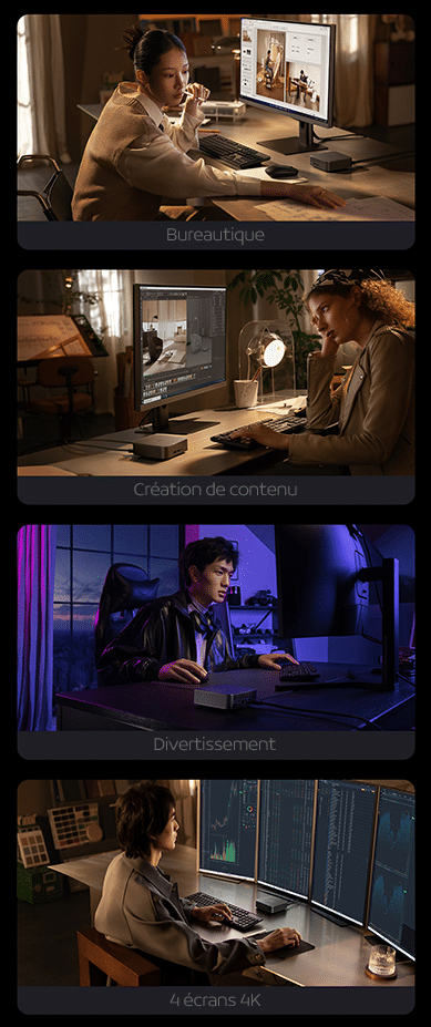Puissant et joli, il peut être utiliser pour de la bureautique, du divertissement ou de la création. Il deviendra votre outil de productivité et il prend en charge la connexion jusqu’à 4 écrans 4K en même temps.
