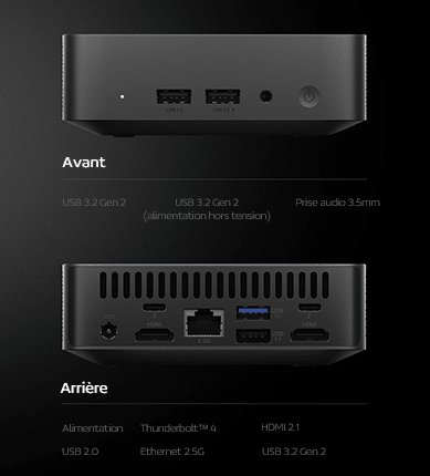 A l’arrière, on retrouve 2 ports Thunderbolt 4, 2 ports HDMI 2.1, une prise Ethernet 2.5G, un port USB 3.2 Gen 2 et un port USB 2.0. Presque tous les périphériques grands public sont ainsi compatibles. La face avant est, quant à elle, équipée de 2 ports USB 3.2 Gen 2 et d’une prise Jack 3.5mm. Le mini PC prend en charge le WiFi 6 et le Bluetooth 5.3.