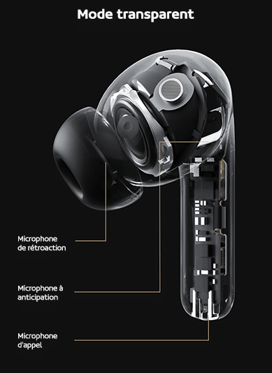 Xiaomi a intégré un mode transparence pour profiter de votre musique tout en écoutant l’environnement ambiant. L’amélioration vocale peut être réglée séparément pour garder la voix claire et ainsi communiquer librement avec vos amis tout en gardant vos écouteurs. Pour arriver à cela, la marque a intégré 3 microphones !