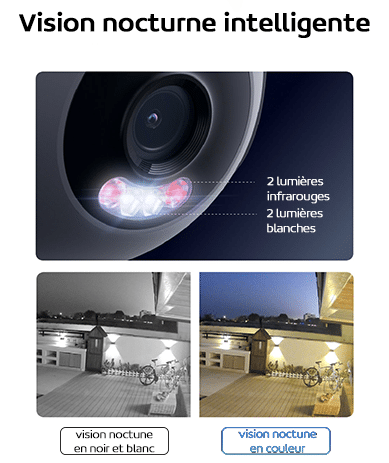 Le capteur à grande ouverture permet d’obtenir des images couleurs même dans des environnements avec de la lumière extrêmement faible. Et pour réaliser la vision nocturne, la caméra intègre deux lumières infrarouges et deux LED blanches. Lorsqu’une silhouette humaine est reconnue la nuit, la lumière d’appoint s’allume automatiquement.