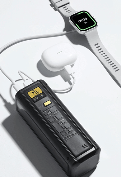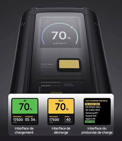 Le design accrocheur proposé par Xiaomi révèle les composants internes grâce à sa coque transparente sur 3 côtés. Un sentiment de technologie puissante est prête à émerger. Les bords et les coins de la coque extérieures sont arrondis et solides rendant la batterie plus confortable à tenir. Un écran avec affichage numérique couleur a été intégré à la batterie pour afficher de multiples informations telles que l’autonomie restante, la vitesse de charge, …