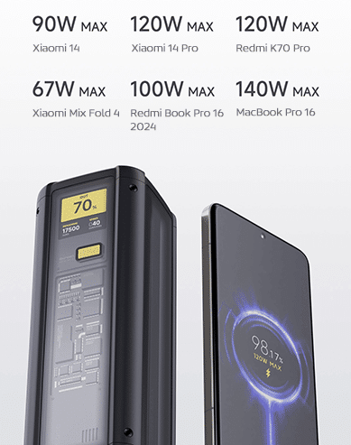 La batterie utilise le protocole de charge PD3.1 apportant une puissance de charge élevée de 140W Max sur un seul port. Cette puissance peut répondre aux besoins de charge d’un MacBook Pro mais également prendre en charge les téléphones Xiaomi qui disposent de l’HyperCharge 120W. Il ne faut avec la Xiaomi PowerBank 25000 212W que 20 minutes environ pour recharger complètement le Xiaomi 14 Pro !