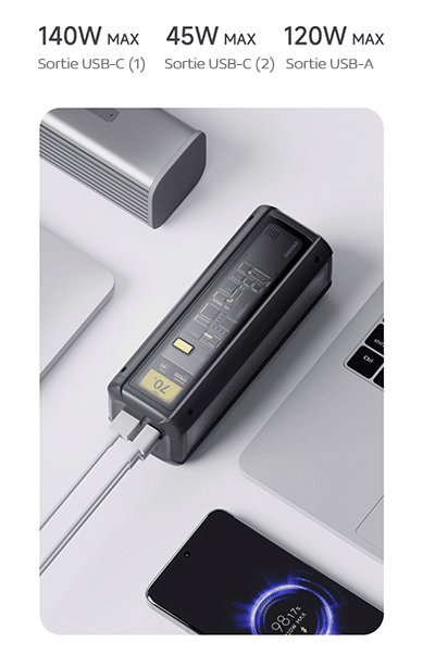 La charge maximum répartie sur les 3 ports de charge est de 212W Max. En effet, la PowerBank est capable de charger simultanément jusqu’à 3 appareils avec une charge maximale de 65W + 27W + 120W. Elle intègre sur le dessus, 2 ports USB-C et 1 port USB-A, et la puissance maximale de chaque port, utilisé seul, est de USB-C (1) 140W, USB-C (2) 45W et USB-A 120W !