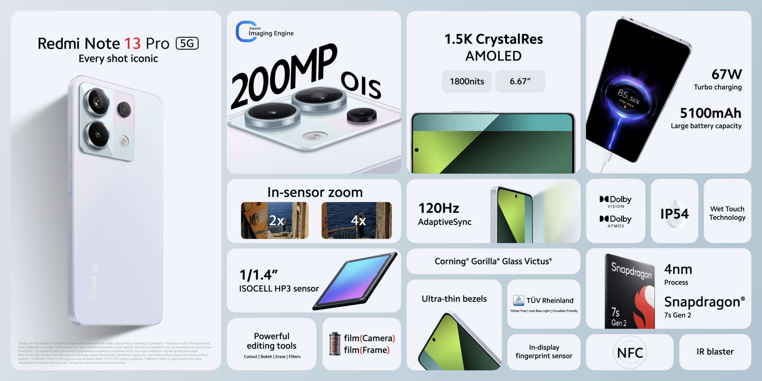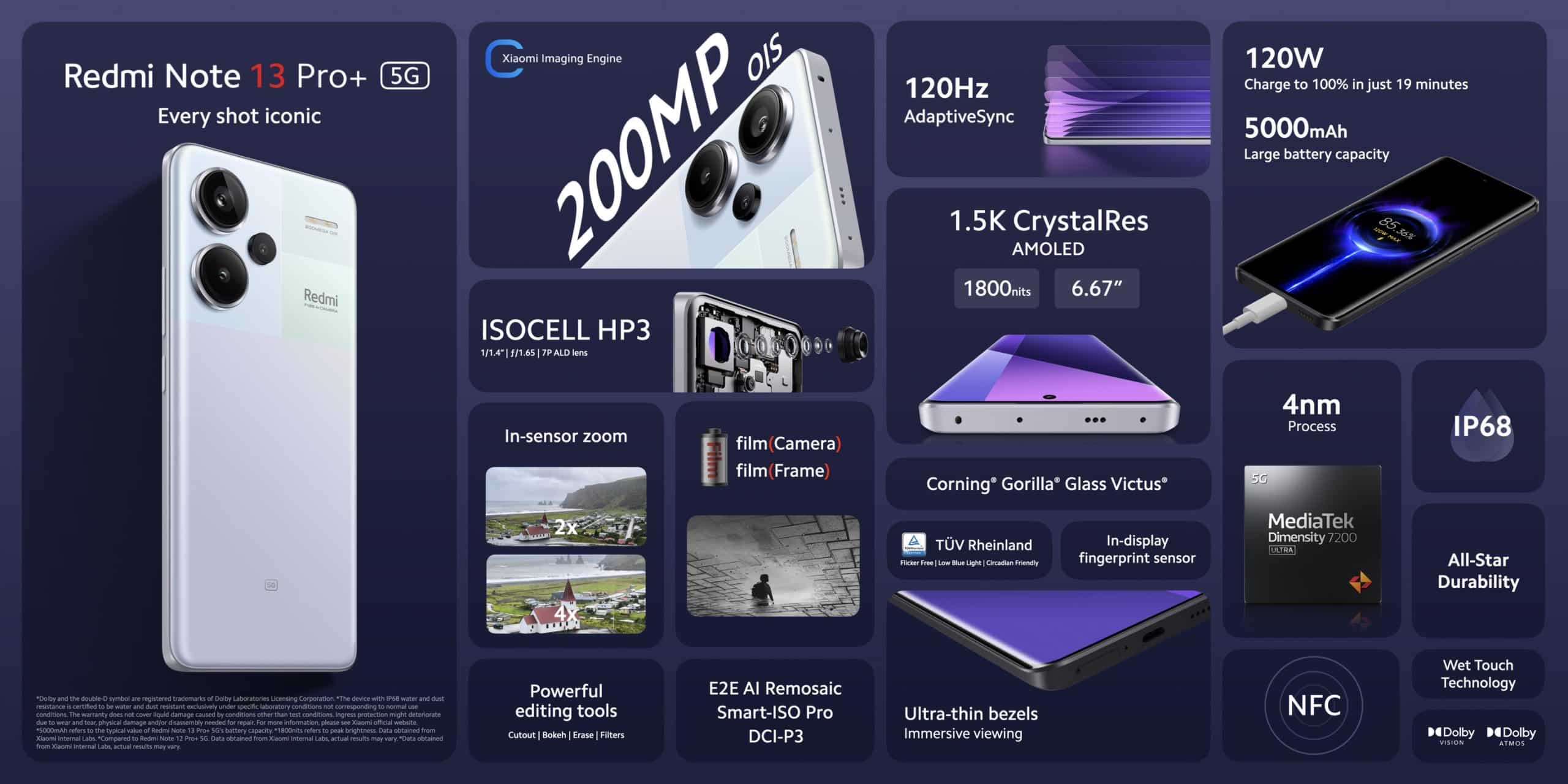 Grâce à sa structure améliorée et à sa certification IP68 de résistance à la poussière et à l’eau, le Redmi Note 13 Pro+ 5G confirme sa position de flagship de la série, tandis que les autres modèles ont tous été améliorés pour offrir une résistance à la poussière et aux éclaboussures de niveau IP54.