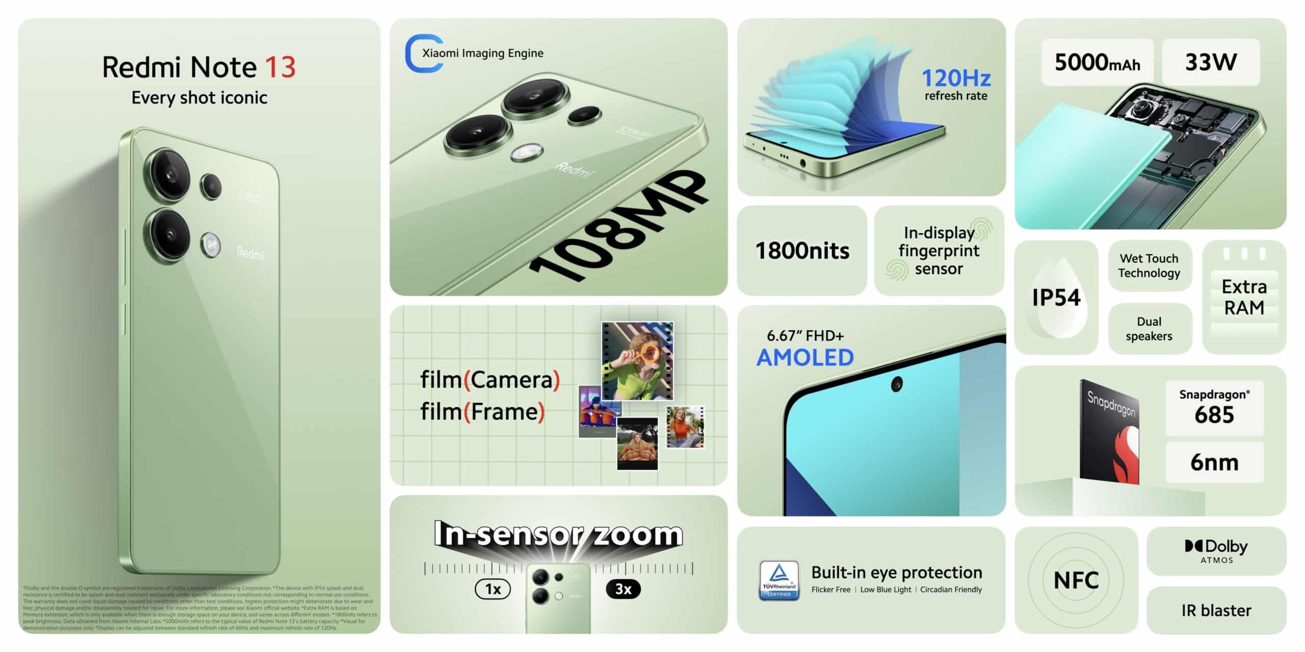 Les modèles de base, le Redmi Note 13 5G et le Redmi Note 13, sont quant à eux équipés d’un appareil photo principal de 108 mégapixels avec un zoom 3x. Les deux smartphones sont également dotés d’une large sélection de filtres filmCamera permettant aux utilisateurs de personnaliser leurs photos.