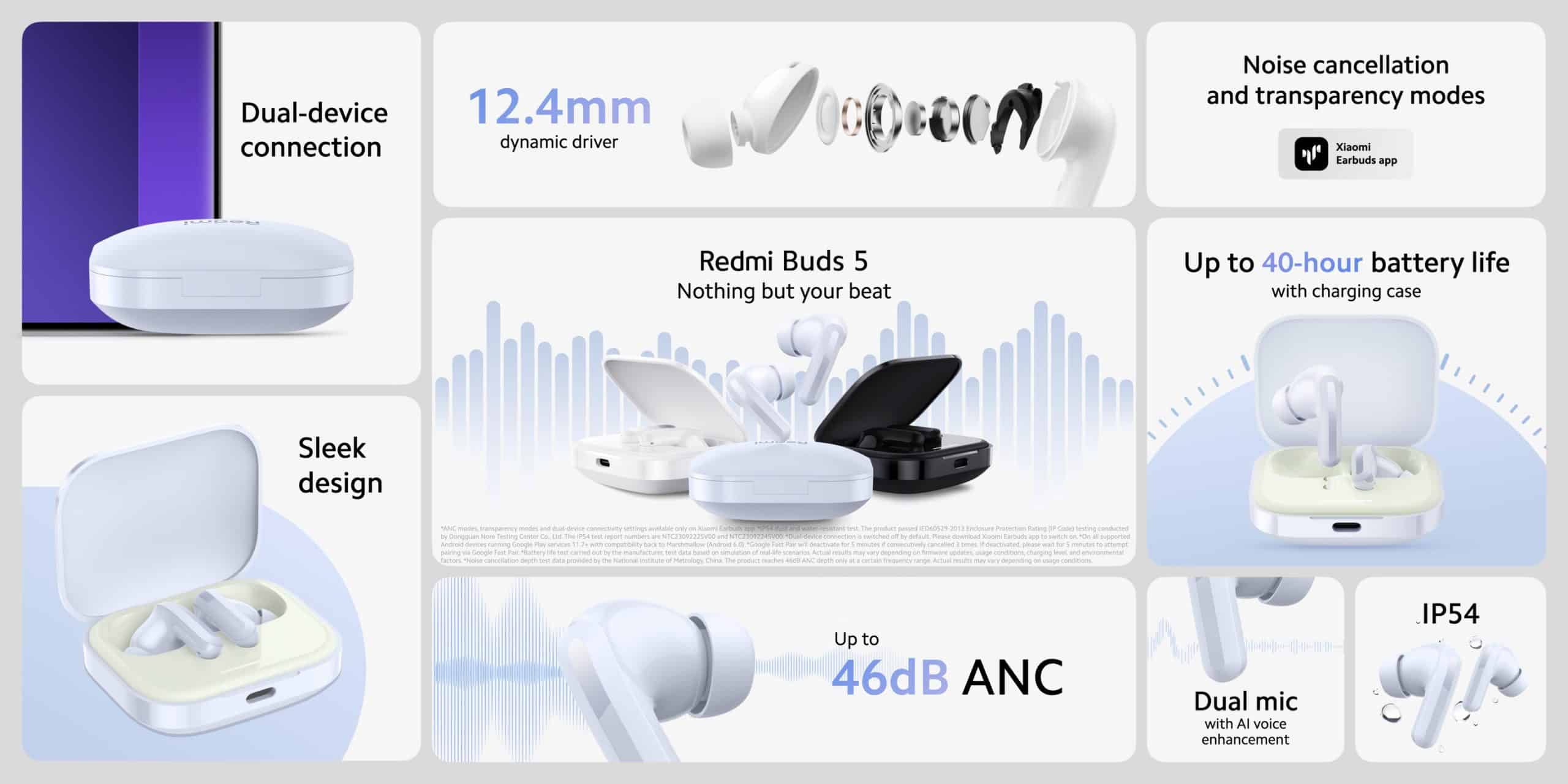 Les Redmi Buds 5 est disponible en Black, White et Sky Blue, au prix de 49€.