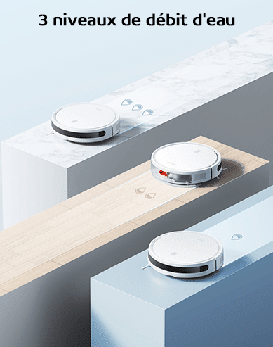 Pour la partie nettoyage, il intègre, en plus de la serpillière, d’un réservoir d’eau intelligent avec 3 niveaux de débit d’eau. Le débit d’eau est ajusté en fonction des différents types de sols pour éviter que les sols ne soient trop trempés.