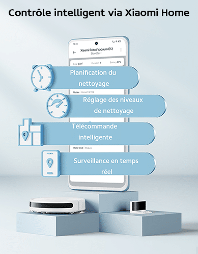Le Xiaomi Robot Vacuum E12 est équipé d’un module de nettoyage avec un réservoir d’eau intelligent. 3 réglages du débit d’eau sont disponibles pour garantir que la serpillière soit correctement mouillée sans tremper le sol.
