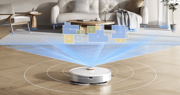 Sur le plan de la navigation et de l’usage intelligent, l’appareil embarque un éclairage structuré grand angle à 129° pour détecter les obstacles et cartographier l’espace de manière précise. Grâce à la technologie laser LDS à 360°, il peut analyser la pièce, créer une carte et mémoriser les parcours pour optimiser les nettoyages ultérieurs. L’application Xiaomi Home permet de piloter l’appareil à distance, définir des zones à nettoyer ou à éviter, ou préciser la puissance selon type de sol.