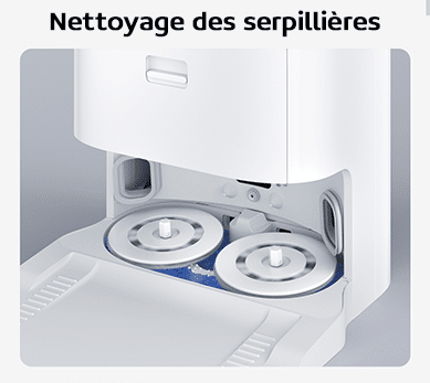 La base intègre un système de nettoyage des serpillière avec un fort débit d’eau pour tremper, puis essorer à grande vitesse et sécher automatiquement. Les serpillières sont ainsi prête pour le prochain nettoyage sans intervention manuelle.