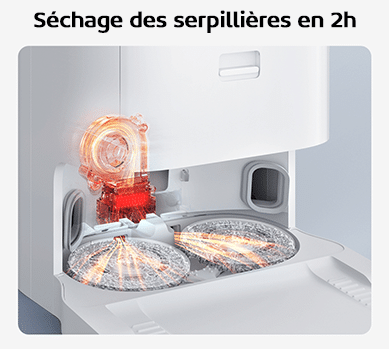 Après le nettoyage des serpillières, la base les sèche à l’air chaud en moins de 2h afin qu’il n’y ai pas d’odeur. Un système de remplissage automatique d’eau permet à la base de remplir le bac d’eau de l’aspirateur.