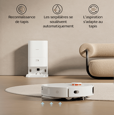 Un capteur a ultrason est situé en dessous en dessous de l’appareil permettant la reconnaissance précise des tapis. Une fois le tapis reconnu, l’aspirateur augmente l’aspiration et soulève les serpillères jusqu’à 7mm évitant de mouiller le tapis.