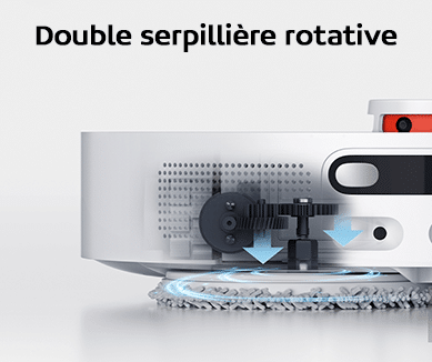 Le système intègre 2 serpillières rondes qui ont une vitesse de rotation de 180tr/min avec un réglage du débit d’eau à 3 vitesses. Les serpillières sont plaquées au sol pour un nettoyage 5 fois plus efficace. Un mode silencieux, qui fonctionne conjointement avec le système d’aspiration, permet de minimiser le bruit lors du nettoyage.