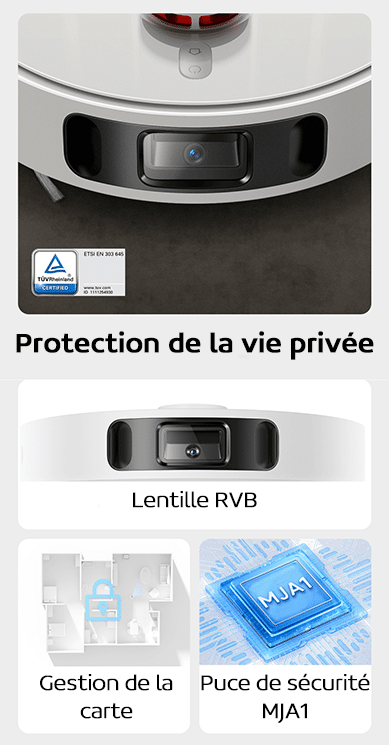 Le robot aspirateur est équipé d’une caméra à l’avant qui est utilisée uniquement pour détecter les objets, protégeant ainsi la sécurité de votre vie privée. Le transfert des cartes et l’utilisation du cloud sont cryptés. L’appareil est en plus équipé d’une puce MJA1 permettant une protection matériel et une protection de transmission de sécurité des données.