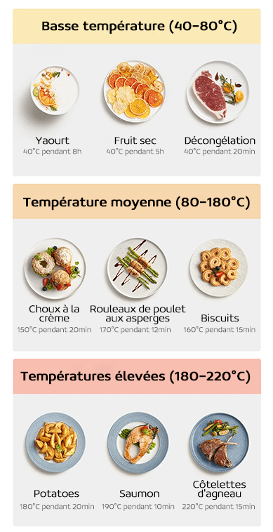 La large plage de température de 40 à 220°C peut être ajustée de façon précise grâce à la technologie de contrôle de température intelligente NTC qui surveille la température pendant tous le processus de cuisson. La température minimale de 40°C permet de maintenir une température constante pour la décongélation, la fermentation ou le séchage des fruits. La température maximale de 220°C est parfaite pour rôtir, frire ou cuire au four.