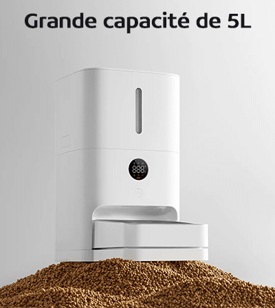 Le distributeur dispose d’une grande capacité de stockage de 5L soit la contenance d’environ 2,5Kg, ce qui est suffisant pour nourrir un chat adulte pendant 30 jours. La marque a amélioré son plan d’alimentation pour vous recommander des quantités d’aliment sur mesure en fonction de votre animal.
