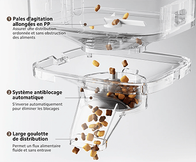 A l’intérieur, on retrouve un système de distribution totalement optimisé qui convient aux croquettes pour animaux jusqu’à 12mm de diamètre. Ce système intègre des pales allongée qui assurent la distribution, un système anti-blocage automatique qui s’inverse pour éliminer les blocage, et une large goulotte qui permet un flux fluide.