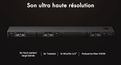 La barre de son de Xiaomi repousse les limites de la conception acoustique avec 3 haut-parleurs large bande, trois tweeters et un woofer autonome. Une profondeur sonore enrichie est proposée avec une puissance totale maximale de 430W.