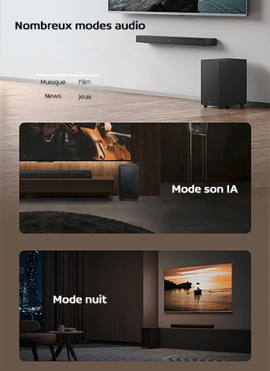 Plusieurs modes audio, conçus par des professionnels, ont été ajoutés pour répondre à différents besoins audios. Pour écouter de la musique, regarder un film ou jouer à un jeu, vous trouverez le mode qui vous convient le mieux. L’intelligence artificielle est présente, et une fois le mode AI Sound activé, la Xiaomi SoundBar 3.1ch s’ajuste automatiquement aux meilleurs paramètres par rapport à la lecture en cours. Il n’y a donc pas besoin de s’embêter à modifier vos paramètres. Un mode nuit a été également ajouté en pensant au rythme de votre vie. Vous souhaitez vous plonger dans un film en pleine nuit sans vous soucier de réveiller et déranger qui que ce soit.