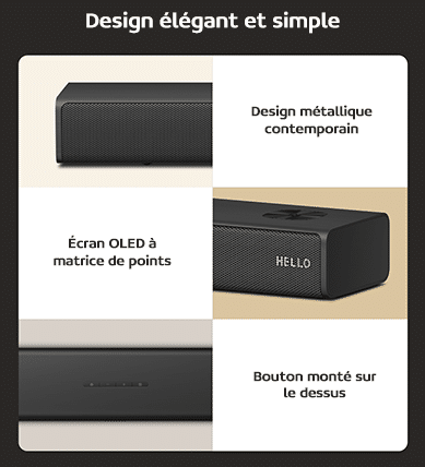 La marque a conçu la barre pour s’intégrer parfaitement dans votre maison, et elle s’harmonise parfaitement afin que tout le monde puisse désormais profiter d’un son de haute qualité avec un design métallique contemporain. Elle intègre un écran OLED à matrice de points et également des boutons sur le dessus.