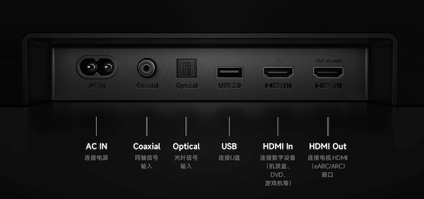 Côté connectique, Xiaomi équipe cette barre de son de plusieurs entrées orientation home-cinéma : HDMI eARC, entrées optique et coaxiale, USB, … Le HDMI eARC permet une transmission sans perte de flux audio, y compris en 4K/120 Hz, avec prise en charge des modes VRR et ALLM pour les contenus gamers. Par ailleurs, une connectivité sans fil est assurée via Bluetooth 5.4, et la barre dispose de fonctions pratiques comme le NFC pour un appairage rapide.