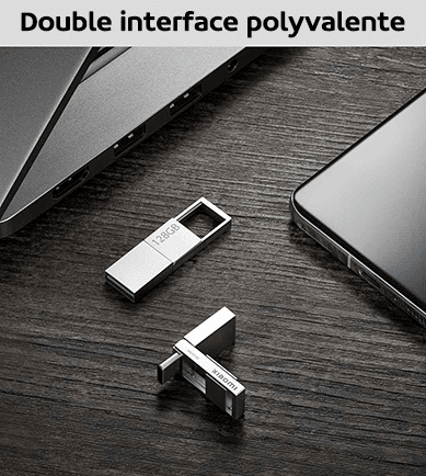 La marque propose une double interface USB-A et USB-C permettant à la clé USB d’être compatible avec un très grand nombre d’appareils numériques grand public comme les téléphones, les tablettes, les ordinateurs … Le transfert de vos documents entre vos appareils est donc facilité.