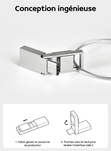 Un assemblage tenon-mortaise permet de révéler le port USB-C facilement. Le couvercle coulissant antichute protège ainsi fortement le port USB-C.