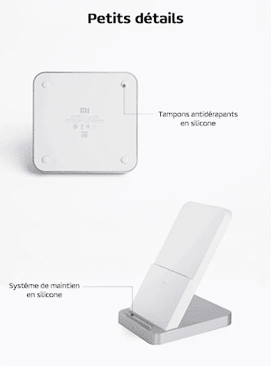Quelques petits détails, la marque a disposé 4 tampons en silicone antidérapant en silicone sous le chargeur et le système de maintien du téléphone est également en silicone.