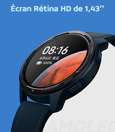 La montre dispose d’un écran Rétina HD de 1,43’’ avec un taux de rafraichissement élevé de 60Hz. L’écran est fluide et le fonctionnement est plus sensible. La prise en charge de l’affichage AoD (Always On Display) est disponible. Toutes les informations sont affichées clairement…
