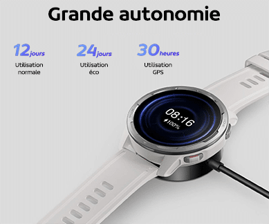 Équipée d’une grande batterie de 470mAh aidée de l’algorithme A1 à faible consommation, la Xiaomi Smart Watch 2 vous permet d’obtenir une autonomie de 12 jours d’autonomie en utilisation normale et jusqu’à 24 jours en mode économie d’énergie. Avec le mode GPS activé constamment, l’autonomie est de 30 heures. La base de chargement est magnétique et permet de recharger la montre en 2,5heures.