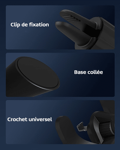 Pour l’accroche dans votre voiture, la marque a adopté les deux modes précédemment utilisés et a ajouté un troisième ! Il s’agit d’un crochet universel spécialement conçu pour la sortie d’air des voitures ! Trois méthodes de fixation pour convenir à une variété de modèles et de positions.