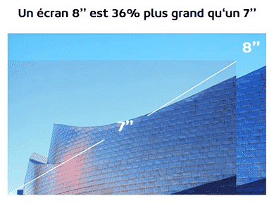Cette version Pro a bien grandi puisque l’on passe d’un écran 4’’ à un écran haute définition de 8’’ avec un angle de vision de 178°. Le processus de laminage complet permet de réduire les reflets. La partie audio a été également améliorée avec l’intégration de 3 Subwoofers et un haut-parleur de 50,8mm. Il dispose d’un amplificateur de son Texas Instrument ainsi que le support DTS permettant d’avoir des graves stables, des aigus clairs et la voix délicate.